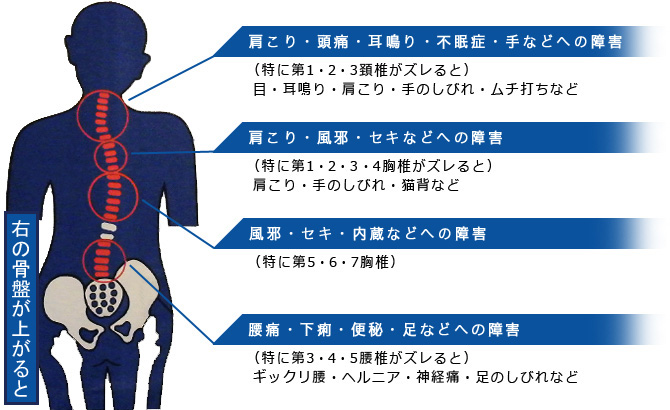 骨盤は体の土台であり歪んだ骨盤の部位によって、それぞれ慢性腰痛・肩こり・頭痛・耳鳴り・不眠症・セキ・下痢・便秘・手足への障害等の様々な症状の原因となります。